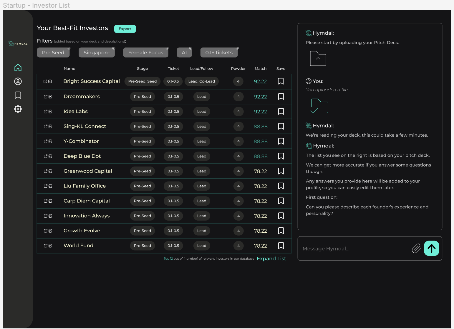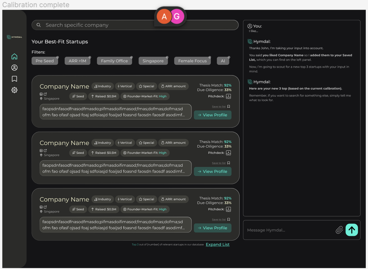 An AI analyst that helps investors and startups build their perfect investment round. Personalized for your fund or fundraise, Hymdal helps you scout, ask better questions during pitches, and automate all the boring bits in due-diligence.